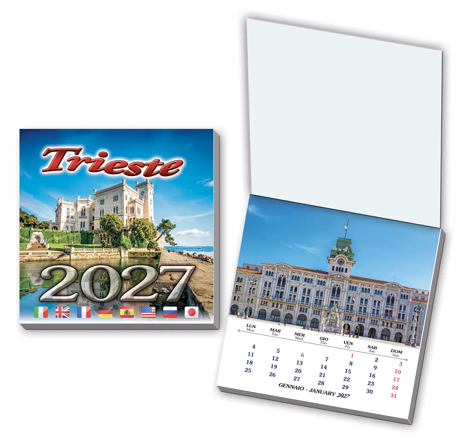 Calendari souvenir formato 7,5×7,5 cm con calamita. Personalizzabili per singola località.